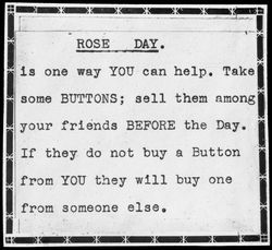 Creator: Judd, Bernard George (1918-1999) Contributing Institution: Moore Theological College Description: Text reads: 'Rose Day is one way you can help. Take some buttons; sell them among your friends before the day. If they do no buy a button from you they will buy one from someone else.' Black and white photograph on glass lantern slide. View Full Item at Moore Theological College -